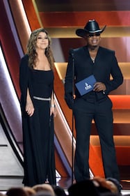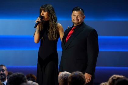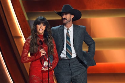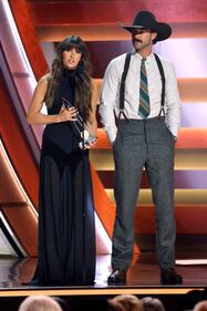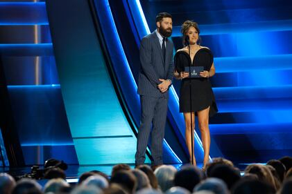 The 59th Annual CMA Awards - Show NASHVILLE, TENNESSEE - NOVEMBER 19: EDITORIAL USE ONLY (L-R) Jordan Davis and Lauren Daigle speak onstage during the 59th Annual CMA Awards at Bridgestone Arena on November 19, 2025 in Nashville, Tennessee. (Photo by Jason Kempin/Getty Images) (Jason Kempin/Getty Images)