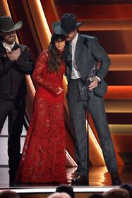 The 59th Annual CMA Awards - Show NASHVILLE, TENNESSEE - NOVEMBER 19: EDITORIAL USE ONLY (L-R) Will Bundy, Ella Langley and Riley Green accept the Single of the Year Award for “you look like you love me” onstage during the 59th Annual CMA Awards at Bridgestone Arena on November 19, 2025 in Nashville, Tennessee. (Photo by Jason Kempin/Getty Images) (Jason Kempin/Getty Images)