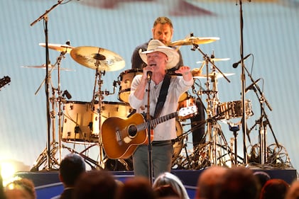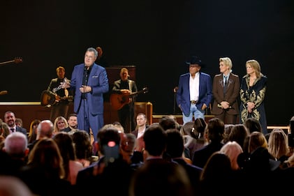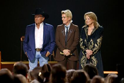 The 59th Annual CMA Awards - Show NASHVILLE, TENNESSEE - NOVEMBER 19: EDITORIAL USE ONLY (L-R) George Strait, Brandi Carlile and Patty Loveless watch as Vince Gill accepts the Lifetime Achievement Award onstage during the 59th Annual CMA Awards at Bridgestone Arena on November 19, 2025 in Nashville, Tennessee. (Photo by Jason Kempin/Getty Images) (Jason Kempin/Getty Images)