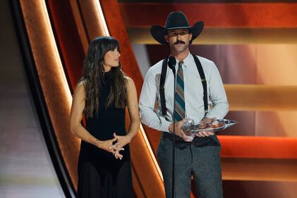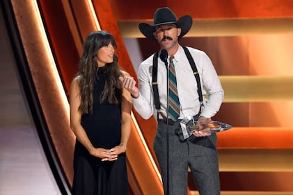 The 59th Annual CMA Awards - Show NASHVILLE, TENNESSEE - NOVEMBER 19: EDITORIAL USE ONLY (L-R) Ella Langley and Riley Green accept the Song of the Year Award for “you look like you love me” onstage during the 59th Annual CMA Awards at Bridgestone Arena on November 19, 2025 in Nashville, Tennessee. (Photo by Jason Kempin/Getty Images) (Jason Kempin/Getty Images)