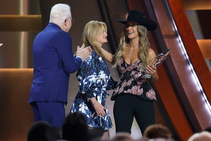 The 59th Annual CMA Awards - Show NASHVILLE, TENNESSEE - NOVEMBER 19: EDITORIAL USE ONLY (L-R) Steve Martin and Alison Brown present Lainey Wilson with the Album of the Year Award for Whirlwind onstage during the 59th Annual CMA Awards at Bridgestone Arena on November 19, 2025 in Nashville, Tennessee. (Photo by Jason Kempin/Getty Images) (Jason Kempin/Getty Images)