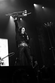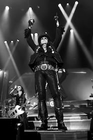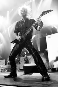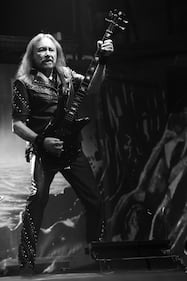 Alice Cooper And Judas Priest Perform At The Kia Forum INGLEWOOD, CALIFORNIA - OCTOBER 19: (EDITORS NOTE: Image has been converted to black and white). Tommy Henriksen performs at The Kia Forum on October 19, 2025 in Inglewood, California. (Photo by Monica Schipper/Getty Images) (Monica Schipper/Getty Images)