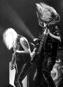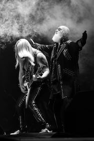 Alice Cooper And Judas Priest Perform At The Kia Forum INGLEWOOD, CALIFORNIA - OCTOBER 19: (EDITORS NOTE: Image has been converted to black and white). (L-R) Richie Faulkner and Rob Halford of Judas Priest perform at The Kia Forum on October 19, 2025 in Inglewood, California. (Photo by Monica Schipper/Getty Images) (Monica Schipper/Getty Images)