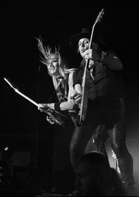 Alice Cooper And Judas Priest Perform At The Kia Forum INGLEWOOD, CALIFORNIA - OCTOBER 19: (EDITORS NOTE: Image has been converted to black and white). (L-R) Nita Strauss and Ryan Roxie perform at The Kia Forum on October 19, 2025 in Inglewood, California. (Photo by Monica Schipper/Getty Images) (Monica Schipper/Getty Images)