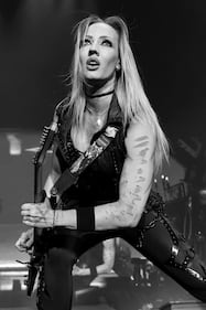 Alice Cooper And Judas Priest Perform At The Kia Forum INGLEWOOD, CALIFORNIA - OCTOBER 19: (EDITORS NOTE: Image has been converted to black and white). Nita Strauss performs at The Kia Forum on October 19, 2025 in Inglewood, California. (Photo by Monica Schipper/Getty Images) (Monica Schipper/Getty Images)