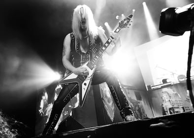 Alice Cooper And Judas Priest Perform At The Kia Forum INGLEWOOD, CALIFORNIA - OCTOBER 19: (EDITORS NOTE: Image has been converted to black and white). Richie Faulkner of Judas Priest performs at The Kia Forum on October 19, 2025 in Inglewood, California. (Photo by Monica Schipper/Getty Images) (Monica Schipper/Getty Images)