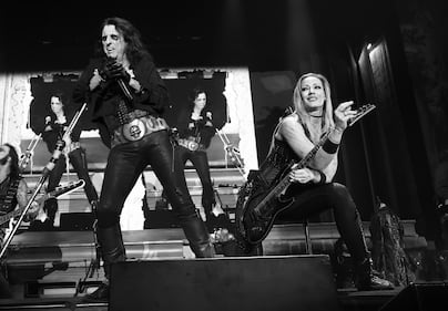 Alice Cooper And Judas Priest Perform At The Kia Forum INGLEWOOD, CALIFORNIA - OCTOBER 19: (EDITORS NOTE: Image has been converted to black and white). (L-R) Alice Cooper and Nita Strauss perform at The Kia Forum on October 19, 2025 in Inglewood, California. (Photo by Monica Schipper/Getty Images) (Monica Schipper/Getty Images)