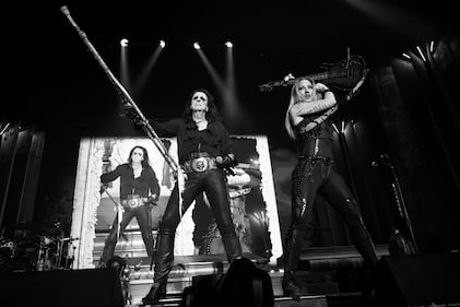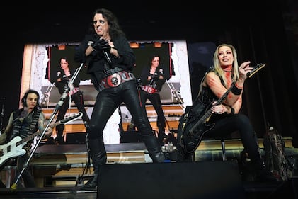 Alice Cooper And Judas Priest Perform At The Kia Forum INGLEWOOD, CALIFORNIA - OCTOBER 19: (L-R) Ryan Roxie, Alice Cooper and Nita Strauss perform at The Kia Forum on October 19, 2025 in Inglewood, California. (Photo by Monica Schipper/Getty Images) (Monica Schipper/Getty Images)