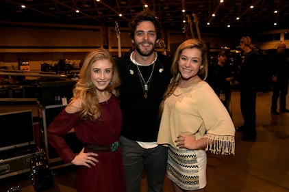 CMT Ultimate Kickoff Party - Rehearsals DALLAS, TX - JANUARY 09: Madison Marlow (L) and Tae Dye (R) of Maddie & Tae pose with Thomas Rhett (center) backstage during rehearsals for the CMT ULTIMATE KICKOFF PARTY LIVE FROM THE COLLEGE FOOTBALL PLAYOFF NATIONAL CHAMPIONSHIP on January 9, 2015 in Dallas, Texas. The 90-minute special premieres Friday, Jan. 9, at 9 p.m. ET on CMT. Hosted by Actor/comedian Rob Riggle, the live television special will feature a star studded lineup including Toby Keith, Lady Antebellum, Big & Rich, Brett Eldredge, Jake Owen, Maddie & Tae, Thomas Rhett and Aloe Blacc. (Photo by Rick Diamond/Getty Images for CMT) (Rick Diamond/Getty Images for CMT)
