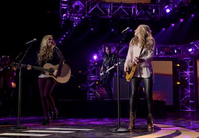 2018 CMT Artists Of The Year - Inside NASHVILLE, TN - OCTOBER 17: (L-R) Maddie Marlow and Tae Dye of musical duo Maddie and Tae, Carrie Underwood, Hannah Mulholland, Naomi Cooke and Jennifer Wayne of musical group Runaway June perform onstage during the 2018 CMT Artists of The Year at Schermerhorn Symphony Center on October 17, 2018 in Nashville, Tennessee. (Photo by Jason Kempin/Getty Images for CMT) (Jason Kempin/Getty Images for CMT)