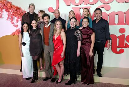 Premiere Of Netflix's "Nobody Wants This" Season 2 - Arrivals LOS ANGELES, CALIFORNIA - OCTOBER 16: (L-R) Andy Weil, VP of Comedy, Netflix, Timothy Simons, Jenni Konner, Jackie Tohn, Justine Lupe, Adam Brody, Bruce Eric Kaplan, Kristen Bell, Nora Silver, Ana Ayala, Brooke Kessler, Director, Original Series, Comedy, Netflix, Erin Foster, Tracey Pakosta, VP, Comedy Original Series, Netflix, Sara Foster, Oly Obst, Allie James, Manager, Comedy Series, Netflix and Ben Harris attend the Premiere of Netflix's "Nobody Wants This" Season 2 at The Egyptian Theatre Hollywood on October 16, 2025 in Los Angeles, California. (Photo by Kevin Winter/Getty Images) (Kevin Winter/Getty Images)