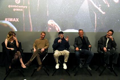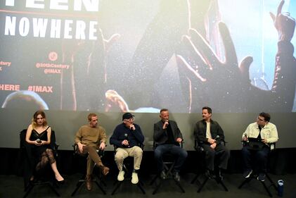 Springsteen: Deliver Me From Nowhere IMAX Special Screening And Q & A CENTURY CITY, CALIFORNIA - OCTOBER 21: (L-R) Odessa Young, Jeremy Strong, Jon Landau, Bruce Springsteen, Scott Cooper, and Daniel Wall speak onstage during the Springsteen: Deliver Me From Nowhere IMAX Special Screening and Q & A at The AMC Century City 15 in Los Angeles, CA on October 21, 2025. (Photo by Alberto E. Rodriguez/Getty Images for 20th Century Studios ) (Alberto E. Rodriguez/Getty Images for 20th Century St)