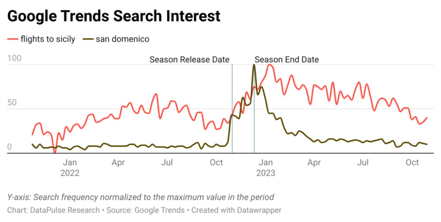 Searches for “flights to Sicily” and “San Domenico” (part of the name of the hotel that hosted Season 2) tell a very clear story. Within three months of Season 2 dropping, searches for “flights to Sicily” grew 144% among U.S. Googlers. Even more dramatically, searches for “San Domenico” rose more than 800% in the month or so after the season premiere.