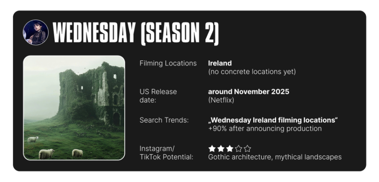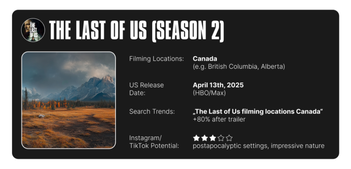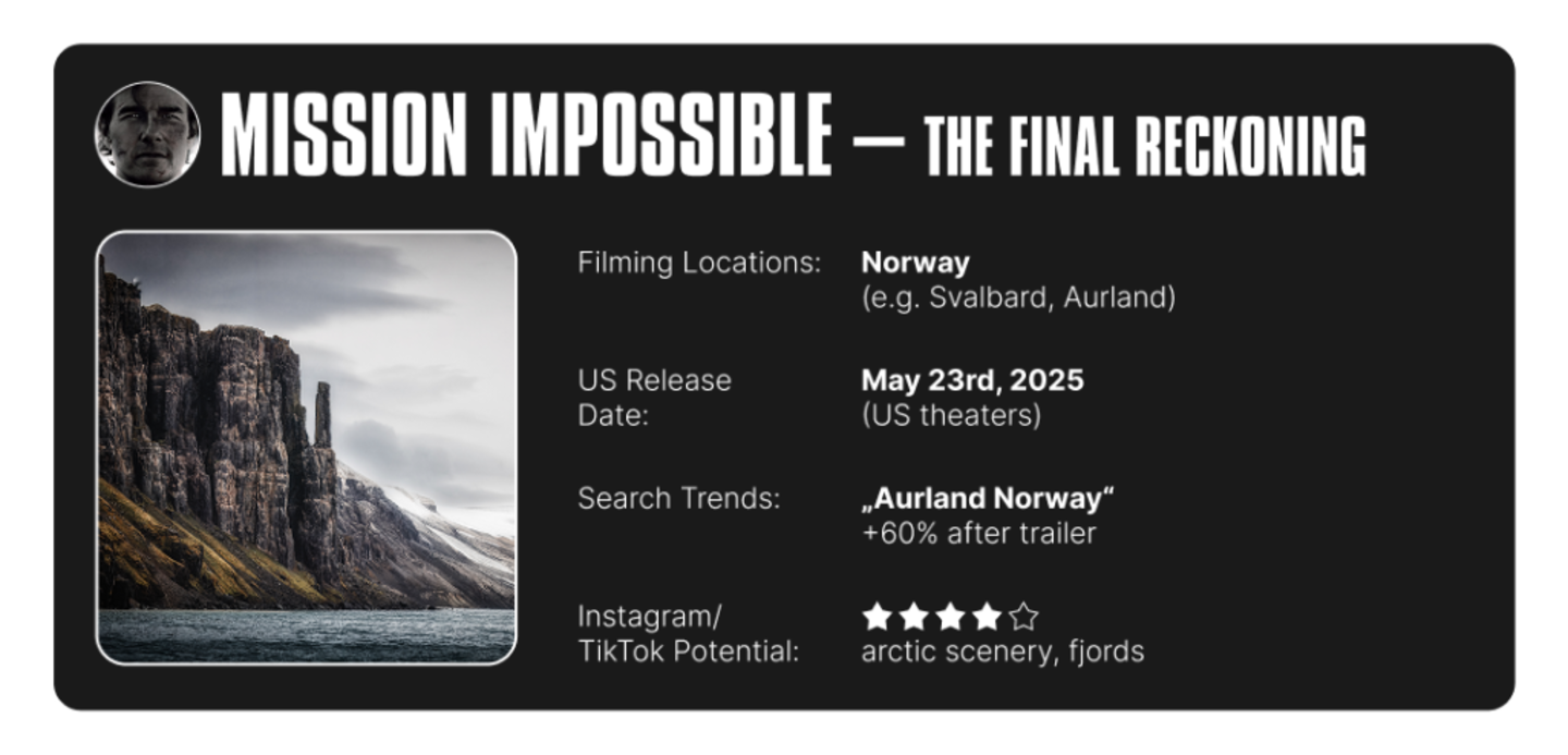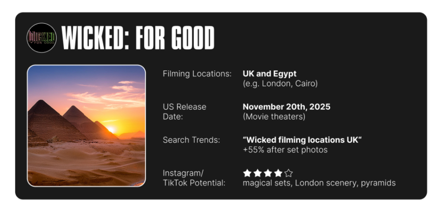 Which upcoming releases could spark the next big travel wave? DataPulse analyzed streaming data, box office expectations, Google search trends, and fan buzz to identify eight destinations with the potential to become global set-jetting hotspots in 2025. From blockbuster sequels to cult TV follow-ups, these locations offer the perfect mix of cinematic appeal and wanderlust potential.
