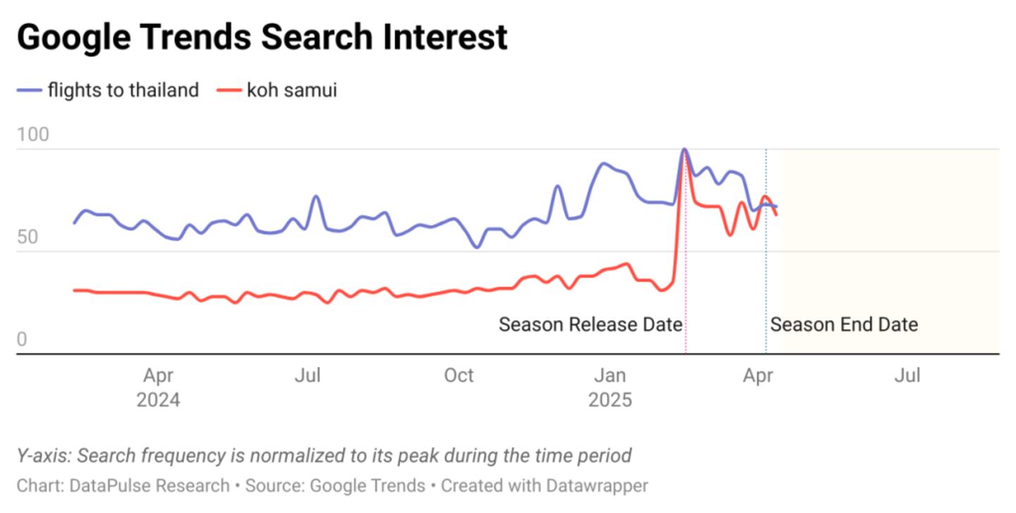 While similar ups and downs can also be seen in the previous six months, searches for “Koh Samui” (the specific Thai island where Season 3 is set) increased 170% after the season dropped.