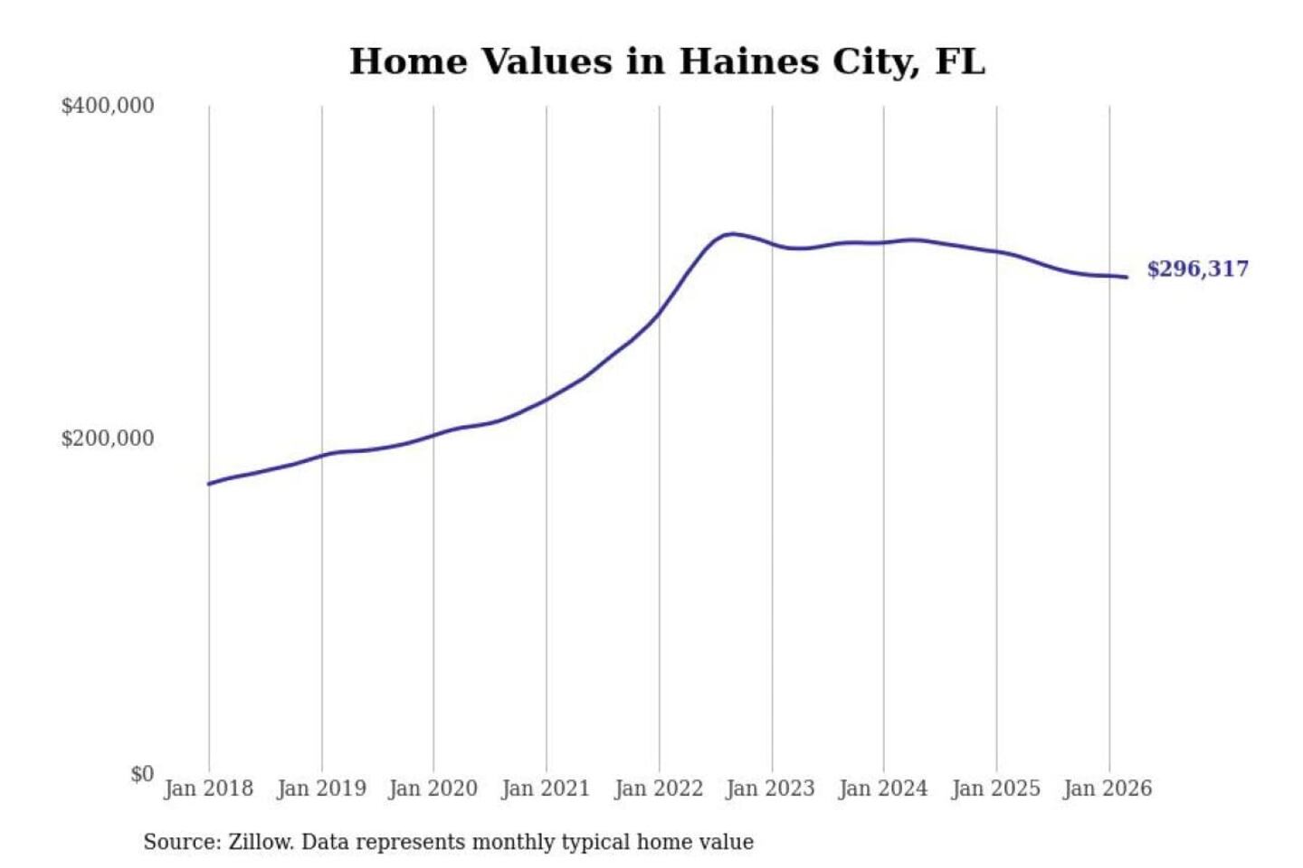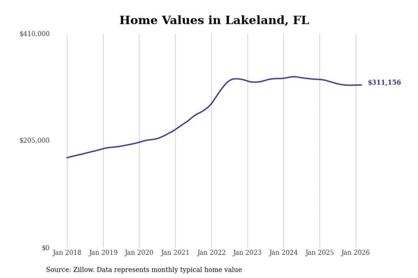 Stacker compiled a list of cities with the most expensive homes in the Lakeland-Winter Haven, FL metro area using data from Zillow. Charts show the monthly typical home value since January 2018.