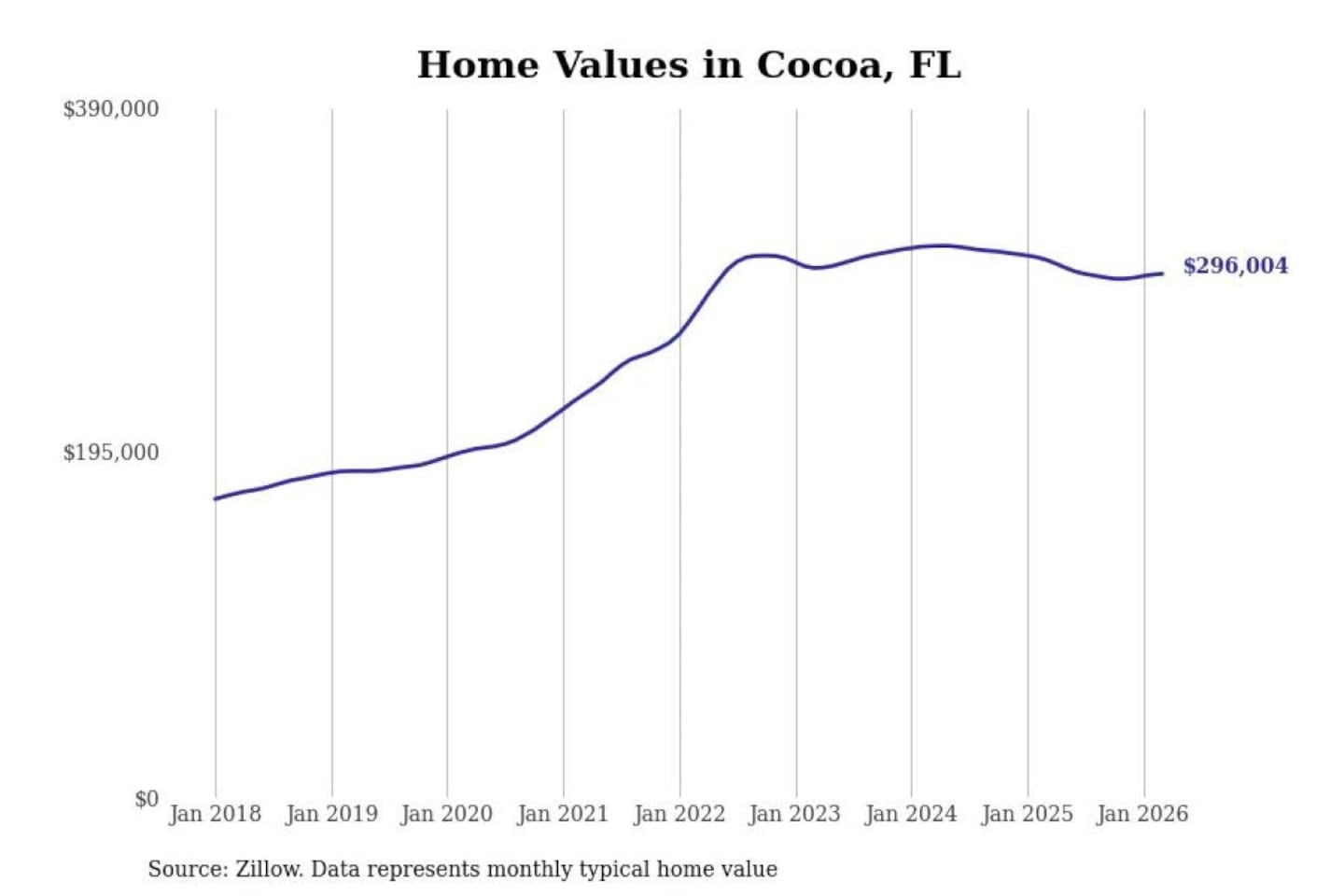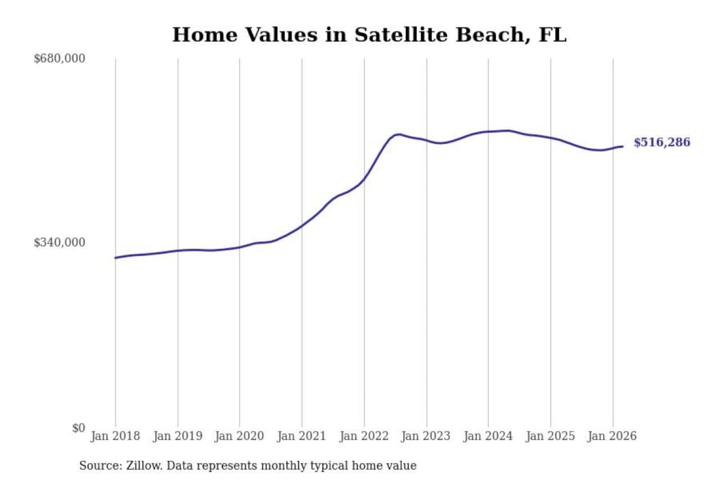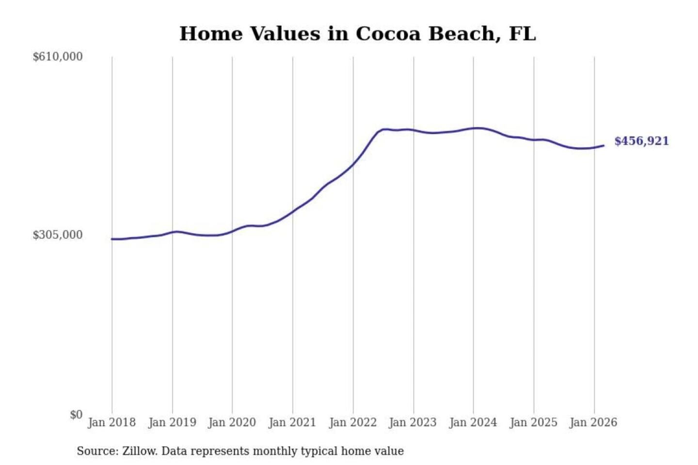 Stacker compiled a list of cities with the most expensive homes in the Palm Bay-Melbourne-Titusville, FL metro area using data from Zillow. Charts show the monthly typical home value since January 2018.